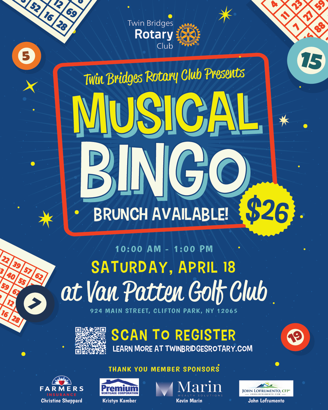 Music Bingo! Brunch is one more chance for you to have some fun, win a prize and help community projects in our area. It’s the same musical bingo game: you recognize some old favorites, claim the spot on your bingo card and win a prize (we hope) or you take part in the 50/50 raffle and win some money (again, we hope). This time you’ll do it in the morning with brunch food and drinks. Seating is limited and advance registration is required so sign up now. Your payment of $26 gets you one bingo card per game. Additional cards may be purchased onsite. A limited brunch menu will be available along with a cash bar.